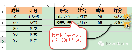 如上图,A1:B6单元格区域依然是一份成绩评价标准表。