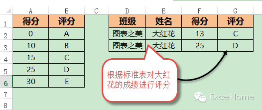 此处的LOOKUP目标区域为B$2:B$6,因此得分13,返回15所对应的B4的值C。