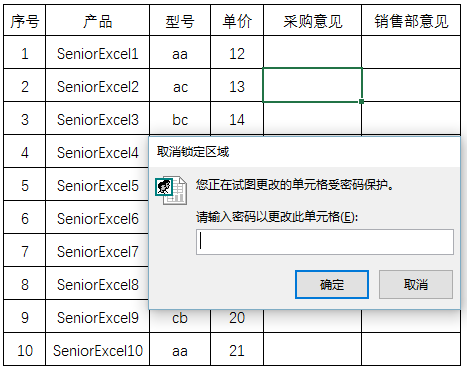 比如一张商品的报价表,需要征求采购部和销售部的意见,每个部门有特定的填写区域,相互不能修改。