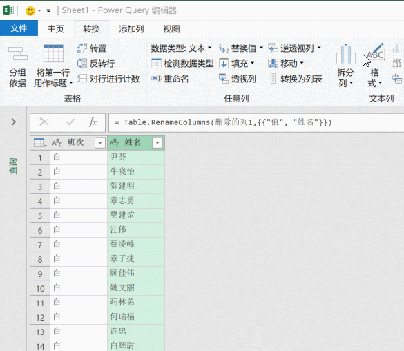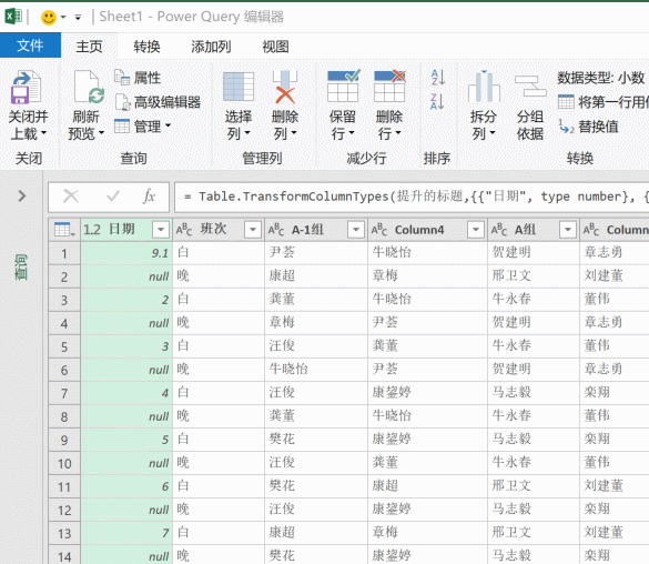 然后单击【班次】所在列列标,然后依次单击【转换】→【逆透视列】→【逆透视其他列】