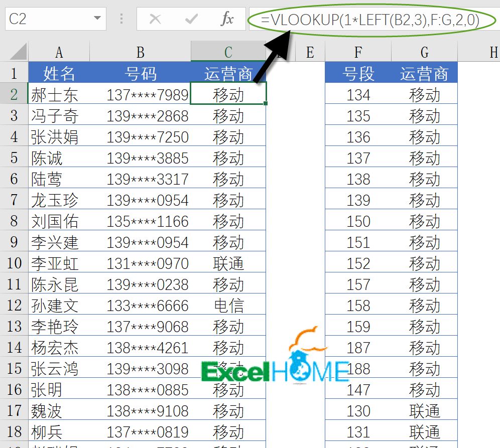 咱们可以使用VLOOKUP函数,以LEFT函数提取出的手机号码前三位作为查询值,在对照表中进行查询就可以了,一起来试试: