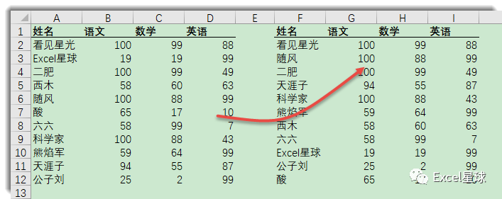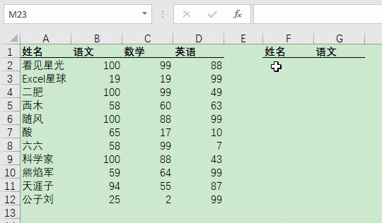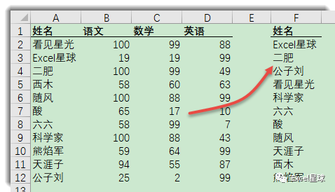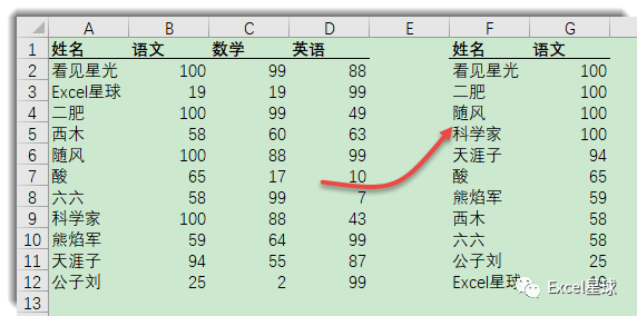 以下图所示的数据为例,A:D是数据源,是一份成绩表,现在需要按语文成绩降序排列,结果如F:G列所示。