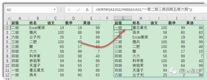 A2:E12是数据源,FIND函数查询A列班级在字符串”一班二班三班四班五班六班”中的位置,返回一个序列号,SORTBY第3参数省略,默认对第2参数排序源作升序排序。