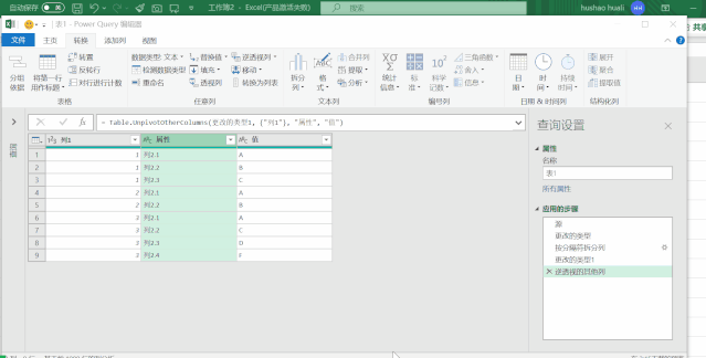 用鼠标点击【列1】,在【转换】中的【逆透视列】选择【逆透视其他列】