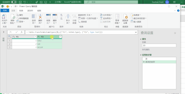 用鼠标点击【列2】,在【主页】选择【拆分列】中的【按分隔符】,分隔符使用逗号,且每次出现分隔符时拆分,确定