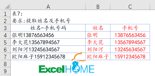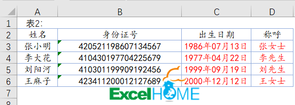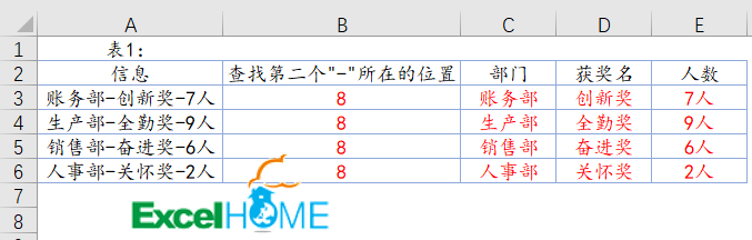 日常工作中,经常碰到需要提取字符的情况,2013及以上版本的Excel中,可以通过“快速填充“功能快速提取字符<快捷键 Ctrl+E>。 但“快速填充“不一定都能识别到我们希望提取的字符,而且当原数据变化时,提取的数据无法跟着一起变化,故此次介绍以下字符提取函数。这些函数可能不是最便利的方法,希望通过这些函数的介绍,提供一些提取字符的思路。 LEFT函数:从一个文本字符串的第一个字符开始返回指定个数的字符。函数结构:=LEFT(字符串,[提取几个字符])第二参数如果忽略,则默认为1。示例:根据表1信息提取部门,C3单元格输入以下公式再向下填充。=LEFT(A3,3) RIGHT函数:从一个文本字符串的最后一个字符开始返回指定个数的字符。函数结构:=RIGHT(字符串,[提取几个字符])同样,第二参数如果忽略,则默认为1。示例:根据表1信息提取获奖人数,E3单元格输入以下公式再向下填充。=RIGHT(A3,2) MID函数:从文本字符串中指定的起始位置起,返回指定长度的字符。函数结构:=MID(字符串,开始提取的位置,提取几个字符)示例:根据表1信息提取获奖名,D3单元格输入以下公式再向下填充。 =MID(A3,5,3)注意:LEFT/RIGHT/MID均为文本处理函数,提取的结果亦为文本,若需参与计算,需转化为数值。 BASE函数:将字符串转换成具有给定基数的文本表示形式。函数结构:=BASE(数字,基数,[字符长度])如果省略第三参数,则不添加前导零。示例:以下公式将数字678按十进制修正为4位,即显示0678。=BASE(678,10,4)FIND函数:返回一个字符串在另一个字符串中出现的起始位置(区分大小写)函数结构:=FIND(要查找的字符,被查找的字符,[从第几个字符开始查找])如果第三参数忽略,则默认为1,即从第一个字符开始查找。示例:查找表1中第二个“-”所有的位置,B3单元格输入以下公式再向下填充。 =FIND(“-“,A3,5)综合应用:1:根据表2身份证号码提取出生年月并生成称呼(性别为女,称女士;性别为男,称先生)。1)出生日期,C3单元格自定义单元格格式为:####”年”##”月”##”日”,然后输入公式向下填充,=–MID(B3,7,8)2)称呼:D3单元格输入以下公式并向下填充:=LEFT(A3)&IF(-1^MID(B3,17,1)+1,”女士”,”先生”)思路:身份证第17位为奇数是男性;偶数则为女性。 2、根据表3产品信息提取尺码。B3单元格输入公式,再向下填充。=MID(A3,FIND(“-“,A3,FIND(“-“,A3)+1)+1,4)思路:从第二个“-” 后的位置开始提取字符,MID的第三参数只需要大于等于所有尺码的长度即可。 3、提取表4中的数字。方法一:B3单元格输入公式,Ctrl+Shift+Enter三键回车,再向下填充。=MAX(IFERROR(–LEFT(A3,ROW($1:$10)),))思路:创建数组依次提取字符,通过“负负得正”转换为数值,并将错误值通过IFERROR转为0再求最大值。方法二:B3单元格输入公式,Ctrl+Shift+Enter三键回车,再向下填充。=MAX(IFERROR(–MID(A3,ROW($1:$9),{1,2,3,4}),)) 4、根据表5中A列编号修正为统一格式。B3单元格输入以下公式,再向下填充。方法一:=”编号”&BASE(A3,10,6)方法二:=”编号”&RIGHT(“00000″&A3,6)5、计算表6中各部门的人数。C3单元格输入公式,Ctrl+Shift+Enter三键回车。=SUM(N(MID(B3,ROW($1:$50),1)=”、”))+1思路:构建数组,每次提取一个字符,计算等于”、”的个数,加1即为人数。6、提取表7中的姓名及手机号。提取姓名,B4单元格输入公式,向下填充。=LEFT(A4,LENB(A4)-LEN(A4))提取手机号,C4单元格输入公式,向下填充。=RIGHT(A4,LEN(A4)*2-LENB(A4))今天的练习文件在此,你也试试吧~~https://pan.baidu.com/s/1diDYm9aqLl52haR-SAZ6eA 提取码: 5e9s图文作者:彭佳 声明:本站所有文章,如无特殊说明或标注,均为本站原创发布。任何个人或组织,在未征得本站同意时,禁止复制、盗用、采集、发布本站内容到任何网站、书籍等各类媒体平台。如若本站内容侵犯了原著者的合法权益,可联系我们进行处理。