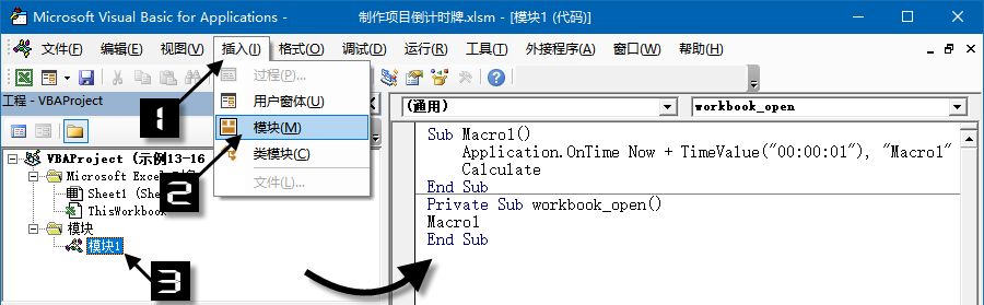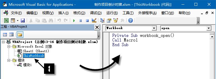 在【工程资源管理器】中单击选中“ThisWorkbook”,在右侧的代码窗口中输入以下代码,然后按F5键,即可在单元格中实现倒计时效果。