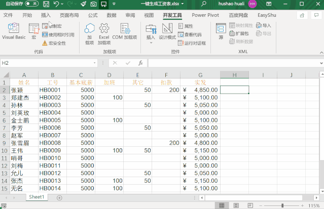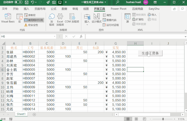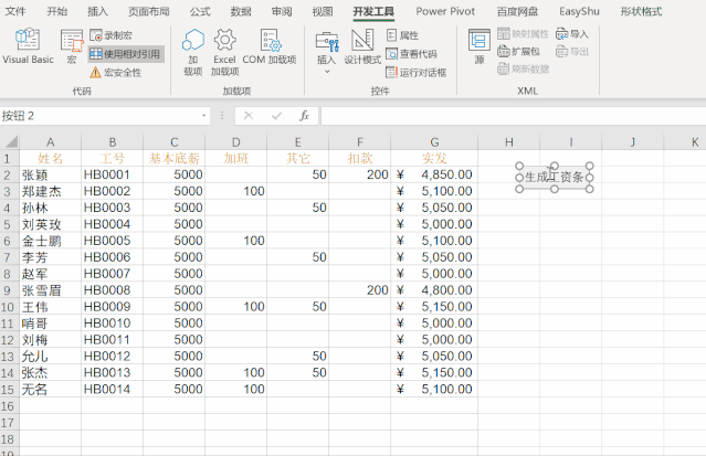 开发工具→插入→按钮→指定宏→选择“宏1”→确定→把按钮名称改为“生成工资条”