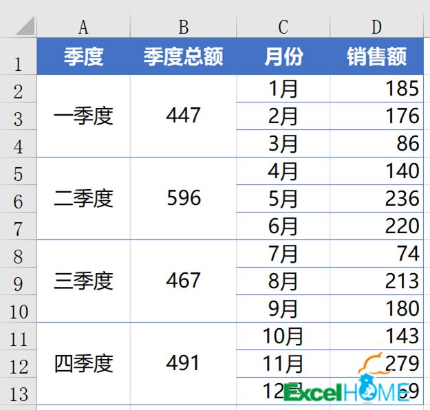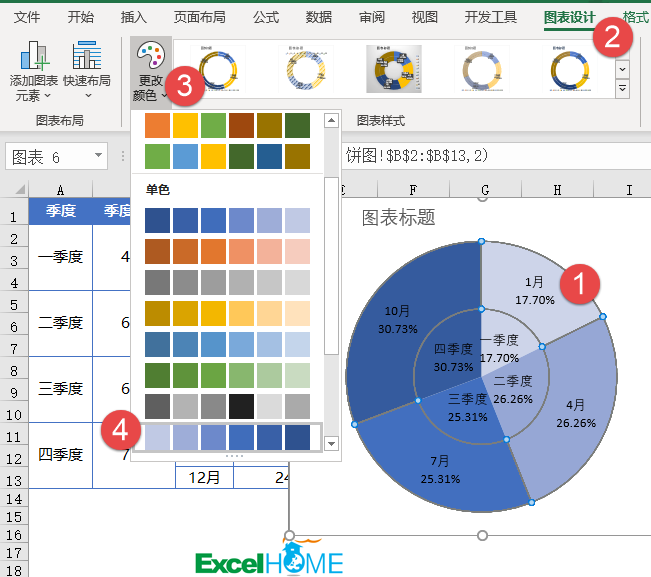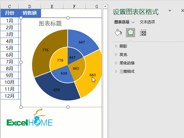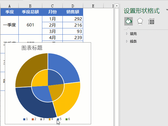 在图表中,不仅可以直观的看到各个月份的销售占比情况,同时还能显示出每个季度的销售比例。