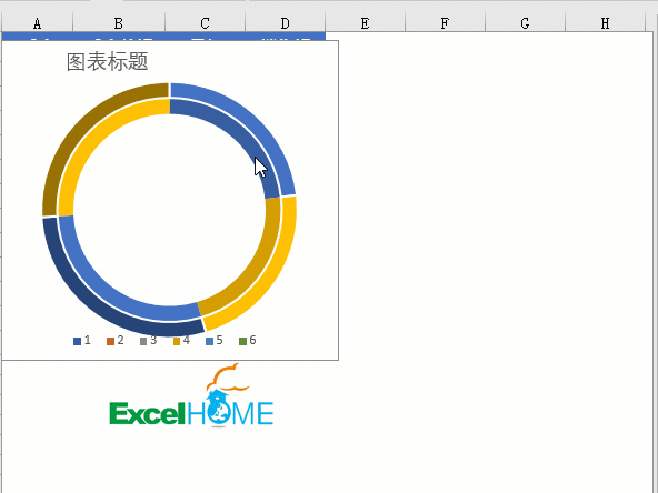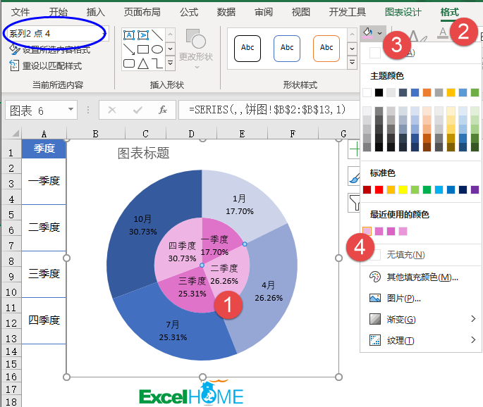 两次单击内侧圆环图的数据系列,选中其中一个数据点,设置填充颜色。