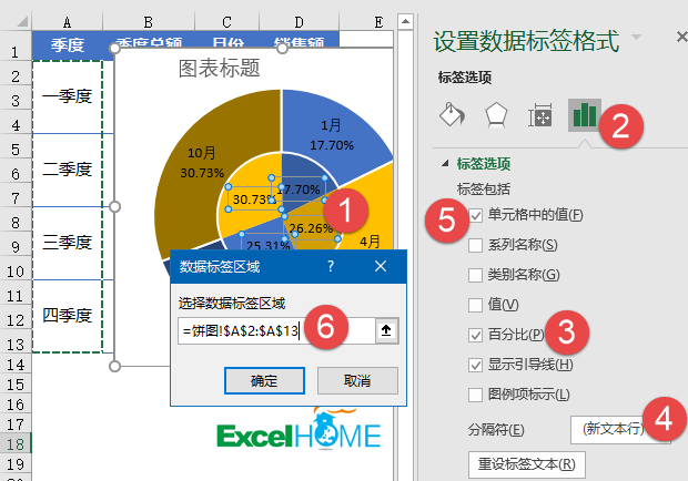 在标签包括【单元格中的值】选项中选择季度名称所在区域,即A2:A13。
