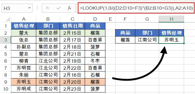 如下图,要根据F3单元格的商品名称和G3单元格的部门,查询对应的销售经理。公式为: