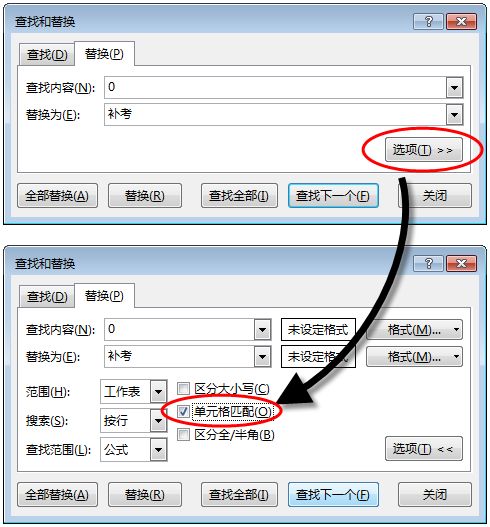 点击【选项】按钮,接下来勾选“单元格匹配”复选框。