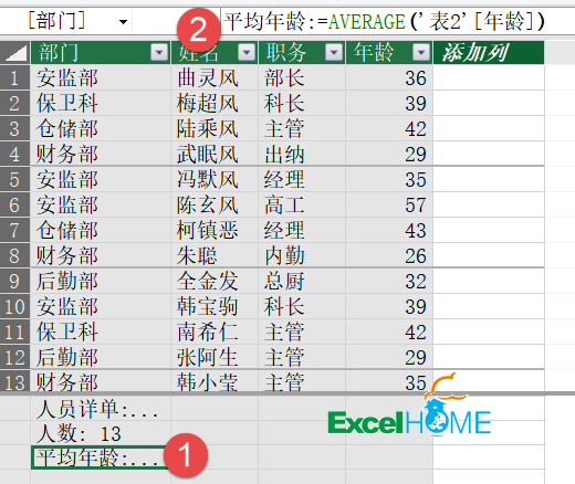 平均年龄:=AVERAGE(‘表2′[年龄])