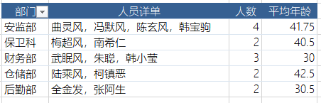现在要根据这些数据,按部门进行汇总。分别得到各部门的人员详单、人数和平均年龄:
