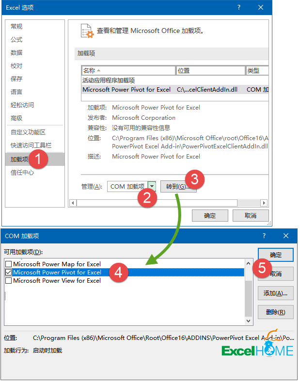 如果你的Excel中没有显示这个选项卡,可以依次单击【文件】→【选项】,打开【Excel选项】对话框。然后按下图所示步骤设置即可。