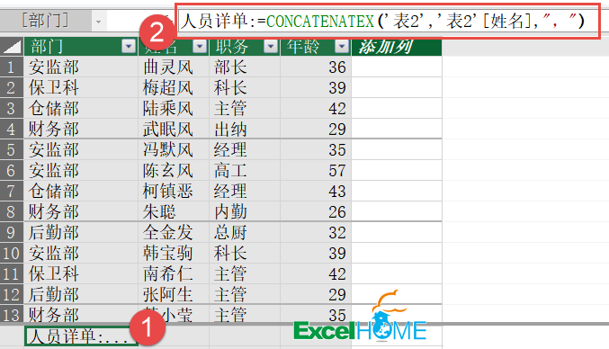人员详单:=CONCATENATEX(‘表2’,’表2′[姓名],”,”)
