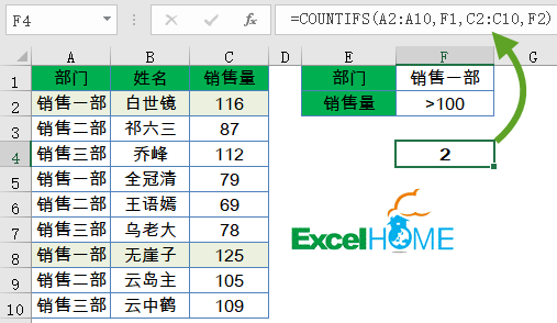 统计“A2:A10中的部门等于F1单元格指定的部门,并且C2:C10单元格区域中的销售量大于100”的个数,统计条件支持通配符。