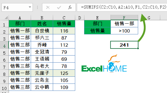如果A列部门等于F1指定的部门,并且C列销售量符合F2指定的条件大于100,就对C2:C10的数据进行求和。