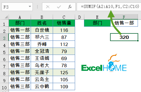 如果A列中的部门等于F1单元格指定的条件,就将对应的C2:C10单元格中的数值求和。