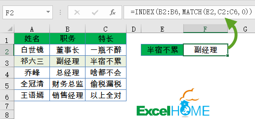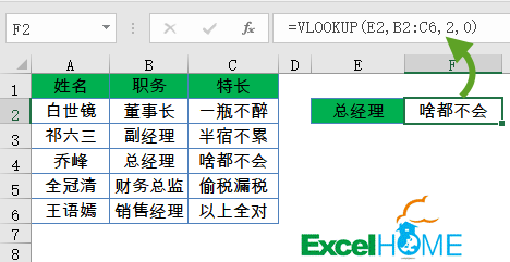 如下图,需要根据E2中的职务“总经理”,查询对应的特长,公式为: