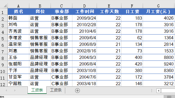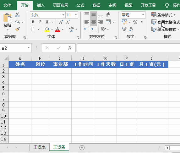 复制“工资表”的列标题,粘贴到“工资条”工作表里。