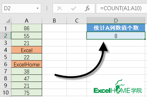 如果A1:A10是COUNT函数的参数,其中只有两个单元格含有数字,那么COUNT函数返回的值是2。