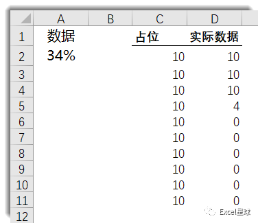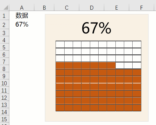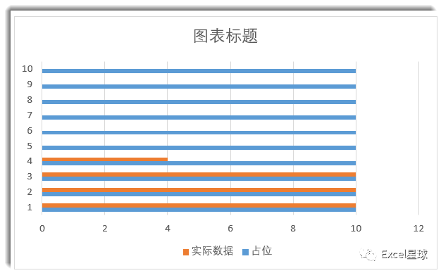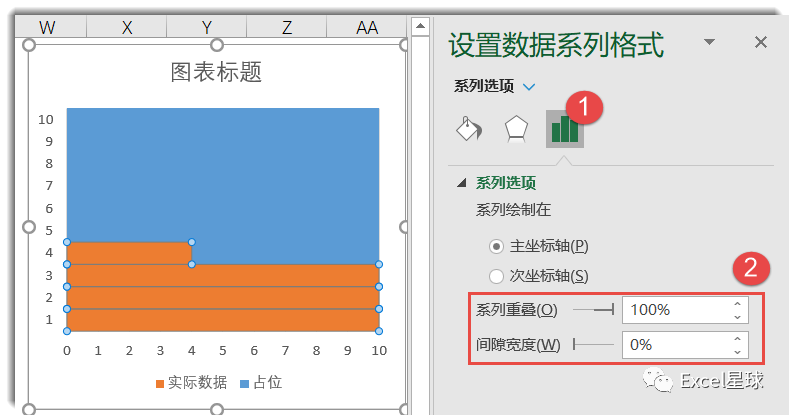 选中条形图系列,在【设置坐标轴格式】窗格→【系列选项】,将系列重叠设置为100%,让两个条形图重叠;间隙宽度设置为0%。