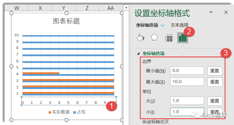 分别选中水平轴/垂直轴,在【设置坐标轴格式】窗格→【坐标轴选项】,将【边界】最小值设置为0,最大值设置为10;【单位】→【大】和【小】均设置为1。