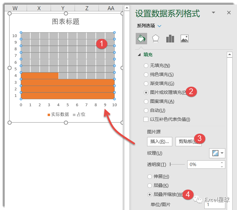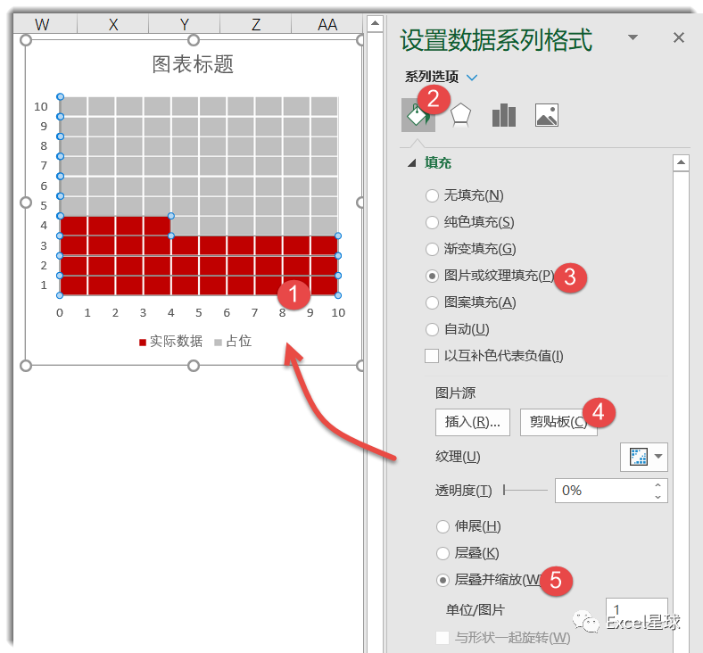 选中浅灰色的正方形,按<Ctrl+C>复制。选中”占位”系列,在【设置数据系列窗格】→【填充与线条】,先选中【图片或纹理填充】复选框,然后点击图片来源下的【剪贴板】,再选中【层叠并缩放】。
