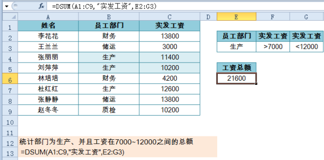 小伙伴们好啊,今天老祝为大家准备了一组日常工作中常用的多条件判断、统计Excel函数公式,让同学们提升工作效率,不再头疼。1、IF函数多条件判断要求:如果部门为生产、岗位为主操 有高温补助。公式: =IF(AND(B2=”生产”,C2=”主操”),”有”,”无”)AND函数对两个条件判断,如果同时符合,IF函数返回“有”,否则为无。2、SUMIF多条件求和要求:统计E2和E3单元格中两个部门的岗位补助总额公式: =SUMPRODUCT(SUMIF(B2:B9,E2:E3,C2:C9))SUMIF函数求和条件使用E2:E3,分别得到两个部门的岗位补助额,再使用SUMPRODUCT函数进行求和。3、SUMIFS多条件求和要求:统计部门为生产,并且岗位为主操的补助总额公式:=SUMIFS(D2:D9,B2:B9,F2,C2:C9,G2)SUMIFS函数求和区域为D2:D9,求和条件为B2:B9=F2并且C2:C9=G24、包含关键字的多条件求和要求:统计部门包含“生产”,并且岗位为主操的补助总额公式:=SUMIFS(D2:D9,B2:B9,“*”&F2&”*”,C2:C9,G2)SUMIFS函数支持使用通配符。5、多条件计数要求:统计统计部门为生产,并且岗位为主操的人数公式:=COUNTIFS(B2:B9,F2,C2:C9,G2)COUNTIFS函数也支持使用通配符,用法与SUMIFS函数相同。6、多条件计算平均值要求:统计统计部门为生产,并且岗位为主操的平均补助额公式:=AVERAGEIFS(D2:D9,B2:B9,F2,C2:C9,G2)第一参数是要统计的数值区域,之后分别是成对的条件区域和指定条件。7、多条件计算最大值和最小值要求:统计统计部门为生产,并且岗位为主操的最高补助额数组公式,注意按Shift+ctrl+回车:=MAX(IF((B2:B9=F2)*(C2:C9=G2),D2:D9))数组公式中,判断多条件时不能使用AND或是OR函数,因此先使用两个判断条件相乘,表示两个条件要求同时符合。再使用IF函数对结果进行判断,两个条件同时符合时,IF函数返回D2:D9中的数值,否则返回逻辑值FALSE。最后使用MAX函数忽略其中的逻辑值计算出最大值。要计算多个条件的最小值时,只要将公式中的MAX换成MIN函数即可。如果你使用的是2019版本,还可以试试MINIFS函数哦。8、多条件查找要求:查询部门为生产,并且岗位为部长的姓名公式:=LOOKUP(1,0/((B2:B9=F2)*(C2:C9=G2)),A2:A9)LOOKUP函数多条件查询套路为:=LOOKUP(1,0/(条件1*条件2*条件n),查询区域)9、使用DSUM函数多条件汇总要求:统计部门为生产、并且工资在7000~12000之间的总额公式: =DSUM(A1:C9,”实发工资”,E2:G3)第一参数为整个数据表区域,第二参数是要汇总的列标题,第三参数是指定的条件区域。注意,第二参数中的列标题以及条件区域的列标题要和数据源中的标题相同。另外,这个函数只能在一个单元格中石油,不能通过拖动复制,有点小遗憾。好了,今天的分享就是这些,祝各位一天好心情!图文制作:祝洪忠 声明:本站所有文章,如无特殊说明或标注,均为本站原创发布。任何个人或组织,在未征得本站同意时,禁止复制、盗用、采集、发布本站内容到任何网站、书籍等各类媒体平台。如若本站内容侵犯了原著者的合法权益,可联系我们进行处理。
