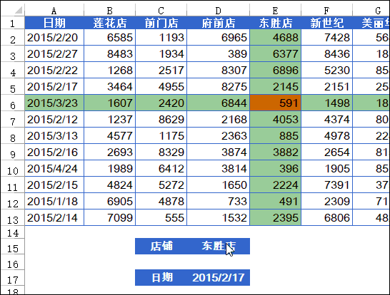 设置完成后,在D15单元格中选择不同的店铺名称或是在D17单元格中选择不同的日期,Excel就会自动更新条件格式的显示效果。