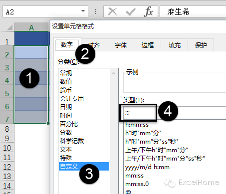 在“类型”输入框中输入三个半角的分号“;;;”。