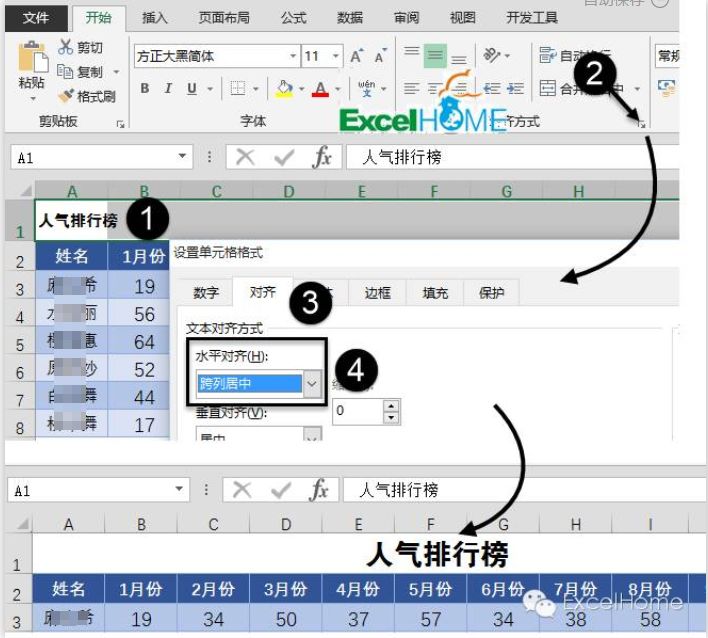 选择要居中对齐文本的单元格,按下图步骤设置,Excel将居中对齐显示文本,而文本实际存储在A1单元格内。