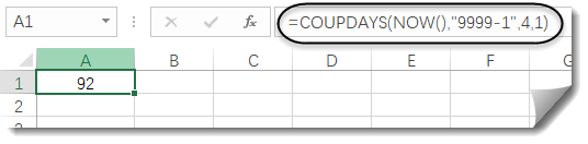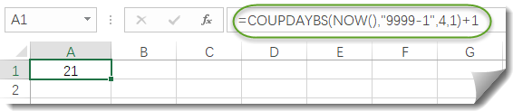 21、=COUPDAYS(NOW(),”9999-1″,4,1)