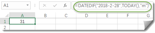 18、=DATEDIF(“2018-2-28″,TODAY(),”m”)