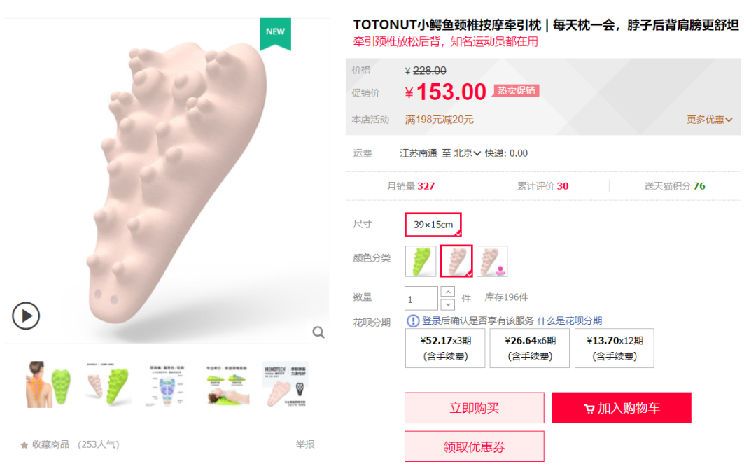 小鳄鱼按摩牵引枕基础牵引版在官方旗舰店的售价是153元,深度牵引版是163元。